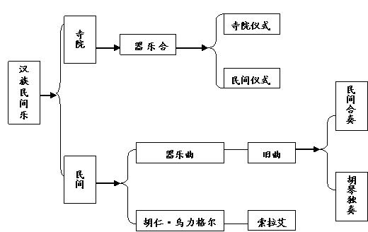 传入南部蒙古地区的汉族民间器乐,先是被寺院接受,改造成仪式音乐。例如,清代蒙古贞地区约有二十多座寺院,都有自己的乐队,乐手由喇嘛自己担任。乐队分室外乐队和室内乐队两种,室外乐队所用的乐器有笛子、管子、笙、箫、云锣、镲、小钹、鼓、梆子等,室外乐队所用的乐器则在此基础上加胡琴、三弦。演奏的场合一般有三种:一是寺院大会、仪式上演奏;二是每有活佛、王公等上层人士驾临时奏乐迎客;三是在民间丧事或者新房落成仪式上演奏。[7]传入蒙古地区的汉族乐曲,通过蒙古社会上、下两层渠道,置入到了蒙古族固有的音乐文化系统当中:一方面它作为特定的仪式音乐,在王府、寺院里传播继续;另一方面则作为种种仪式的、娱乐的艺术形式在民间社区传布。传入蒙古族民间的汉族乐曲又分为三支系统:一是作为民间合奏曲;二是演变为胡琴独奏曲;三是被纳入到新兴的胡仁·乌力格尔音乐体系当中。在民间合奏或胡琴独奏曲领域中,相对于民歌、说唱音乐曲调,这些曲调被称为“旧曲”(hagucin aya);在胡仁·乌力格尔音乐当中,相对于“艾”[8],这些曲调被称为“索拉艾”[9]。