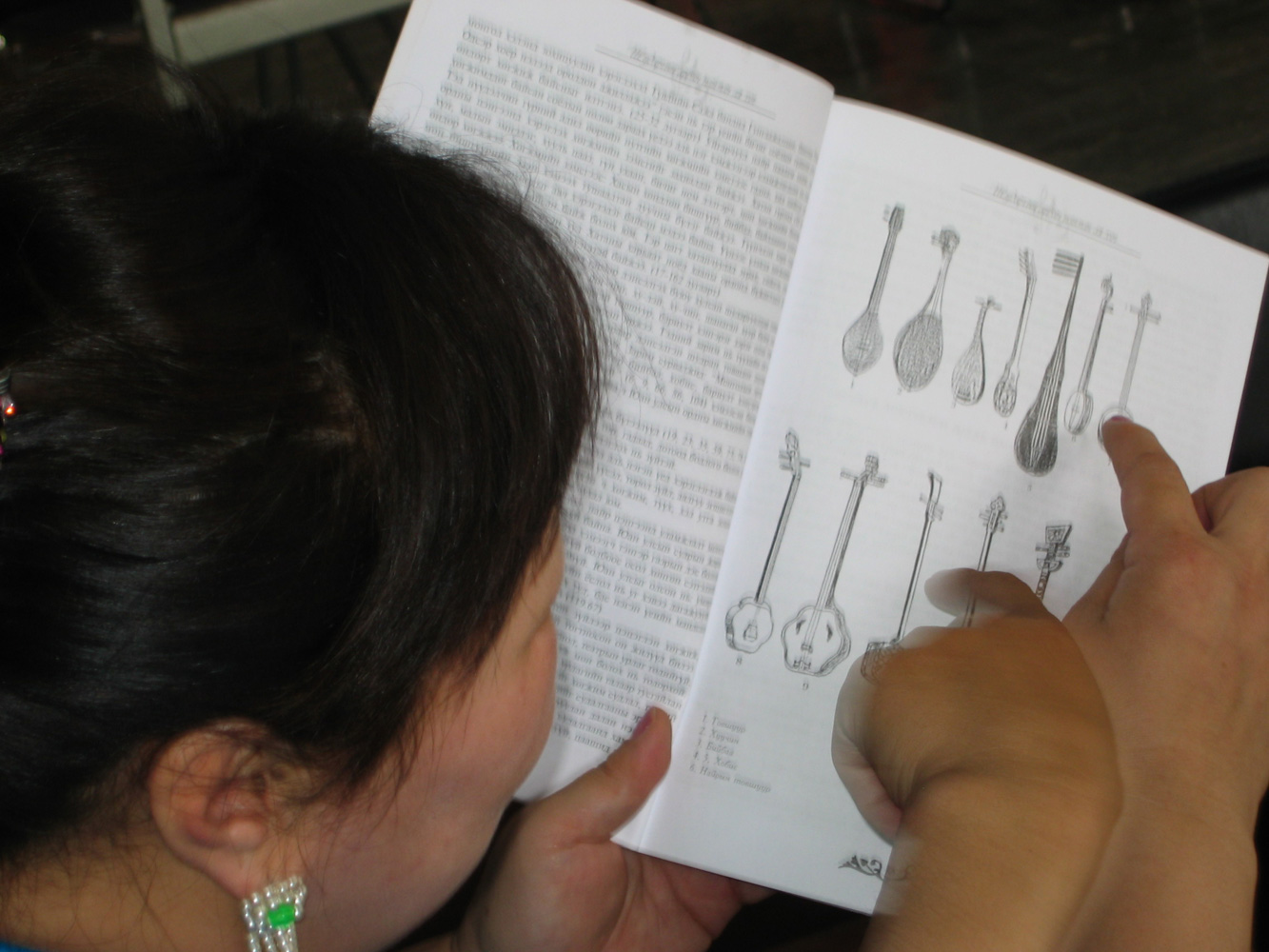 还有2007年6月在内蒙古大学艺术学院召开的“首届国际蒙古三弦艺术研讨会”上,蒙古国学者乌云其木格教授演讲时所展示的图片8,其弦轴也是左二右一。如图四: