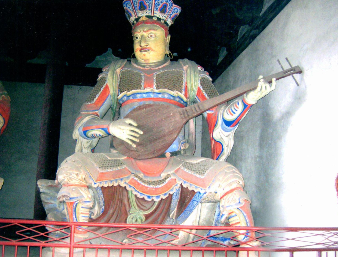 2007年夏,刚参加完“首届国际蒙古三弦艺术研讨会”,我和李凤山先生,相伴来到了山西省的大同市,想利用这次难得的机会,顺道仔细欣赏一下这座在古代被称为“一代京华,两代陪都,四朝重镇”的北方中国的中心城市。当看到在善化寺天王殿的一景时,感到非常吃惊,顿时就兴奋了起来。东方持国天王手持的竟然是三弦!这一重大发现,使我们俩忘记了旅途的劳顿。心想如果早看到此像,便可在呼市召开的“首届国际蒙古三弦艺术研讨会”上作补充发言。