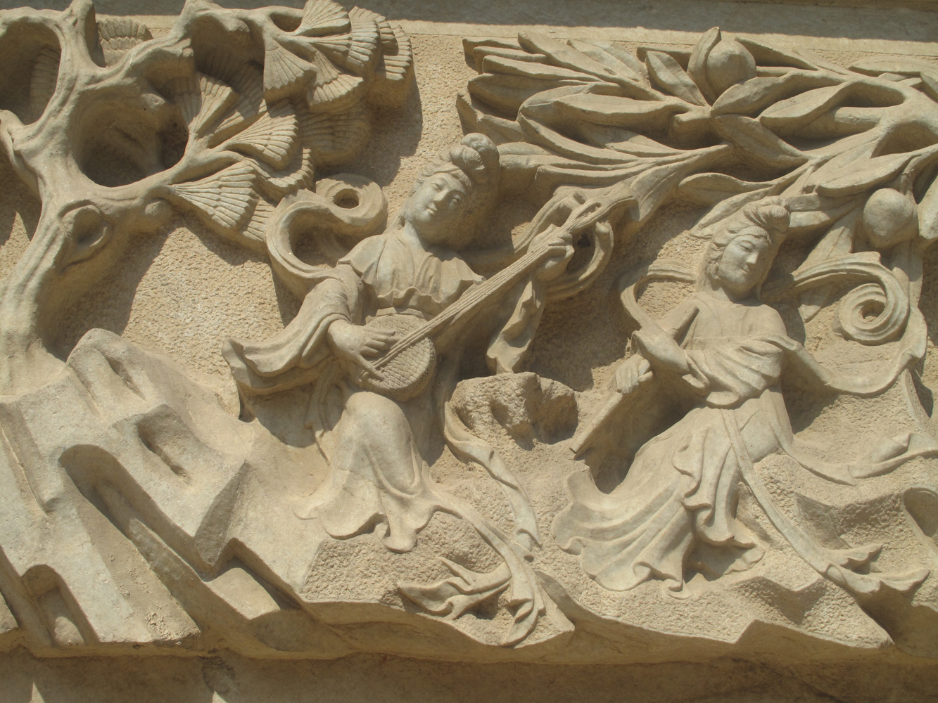 山西省五台山南山寺石刻俘雕三弦图的弦轴也是左二右一。如图三: