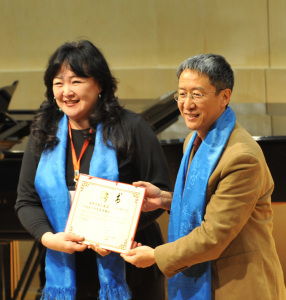13日晚7:30,中央音乐学院演奏厅座无虚席,在我院民乐系三弦教授谈龙建老师的主持下拉开了蒙古族三弦音乐会的帷幕。在音乐会前,由我院副院长周海宏教授为蒙古国国立文化艺术大学教授乌云其木格Luvsannorov Oyunchimeg博士颁发了中央音乐学院客座教授的证书。这是我院三弦专业的第二位国际专家获此殊荣。(第一位三弦专业的客座教授是日本三味線演奏家本绦先生。)