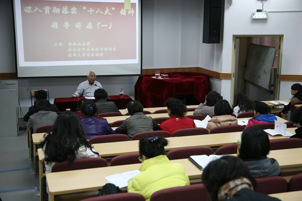 12月6日下午,总支邀请到原北京市委组织部副部长、清华大学客座教授韩铁成先生来到附中,为大家做了学习贯彻“十八大”精神的辅导讲座。附中党总支书记石海彬、副书记李鲁明、总支委员刘美琴副校长以及全体党员、入党积极分子、部分教职员工参加了此次学习活动。
