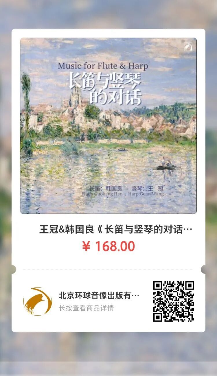 中央音乐学院管弦系竖琴专业教授、博士生导师、打击乐竖琴吉他教研室副主任王冠,携手中央音乐学院长笛专业教授 、博士生导师韩国良,共同推出了最新专辑《长笛与竖琴的对话》,收录《美丽的旋律》《二重奏组曲》《西西里舞曲》等多首经典曲目。该专辑由中央音乐学院北京环球音像出版有限公司独家出版并全球数字发行。